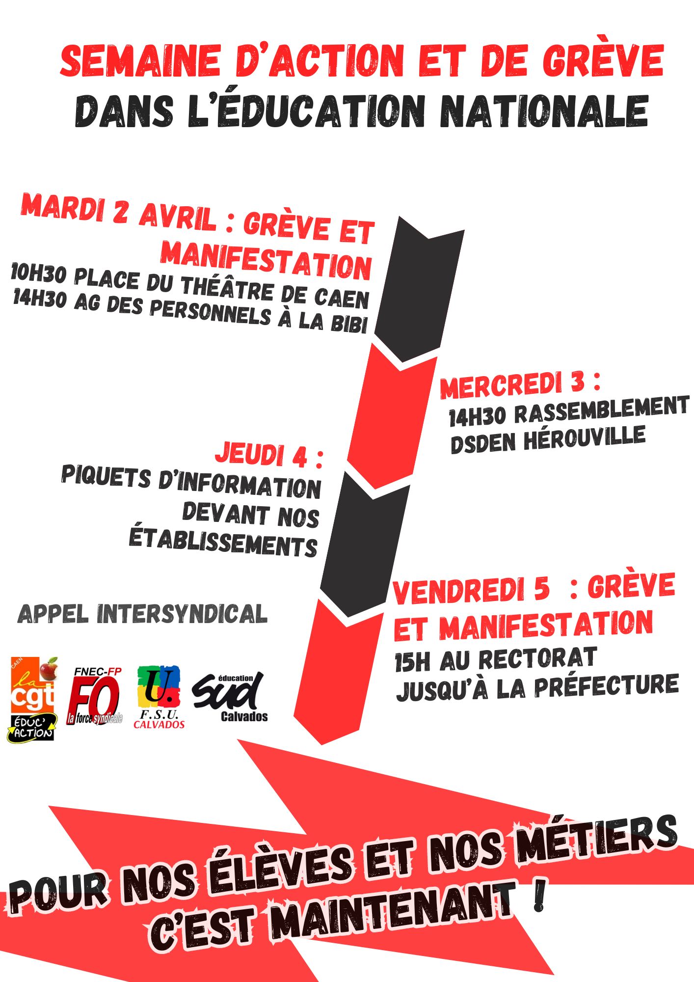 Après plusieurs mobilisations réussies en février, faisons monter la pression et accentuons la lutte L’intersyndicale du Calvados appelle à se mobiliser dès le mardi 2 avril et poursuivre les actions.