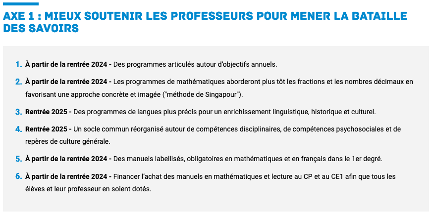 - « Reprendre en main le contenu et les modalités des enseignements : […] :Le détail des programmes et les labels validant les manuels scolaires relèveront du ministre de l’Éducation nationale. »